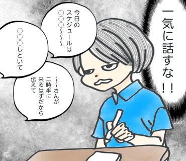 ②頭の中で話をまとめる(聴覚理解の低下・注意の持続性の低下で内容が飛んでる)